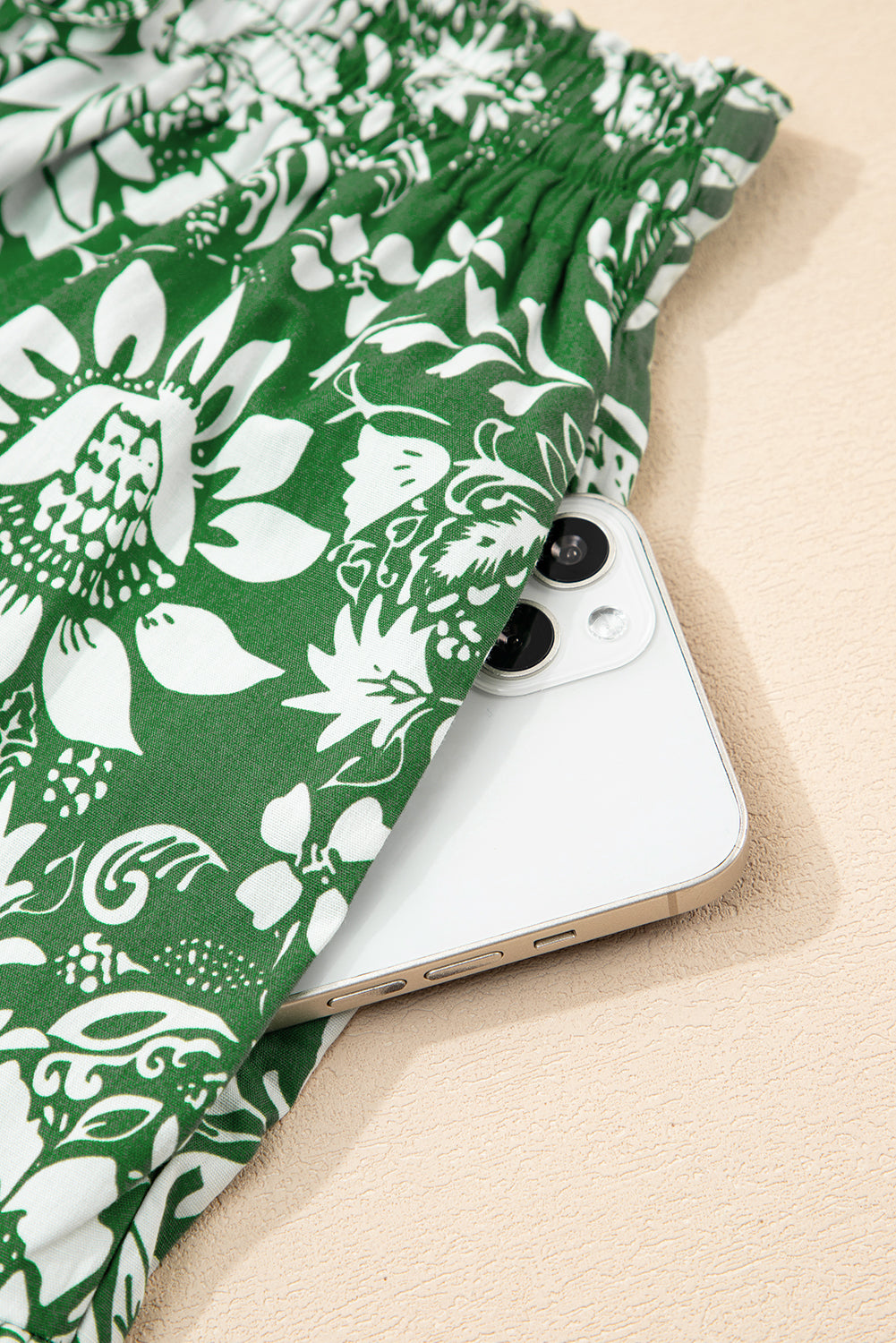 Green Floral Print Shirred Crop Top and High Waist Midi Skirt Set